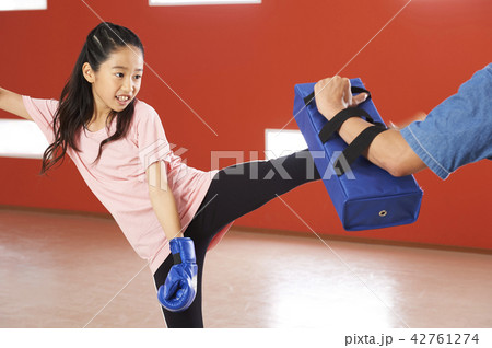 パーソナルトレーナーにキックボクシングを習うアジア人女性