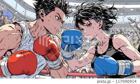 ボクシング試合:若い男性ボクサーと女性ボクサーの試合