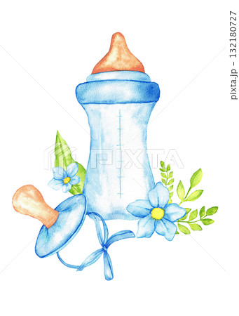 Watercolor baby bottle with blue floral decor for nursery art and baby shower invitations. Illustartion for gender reveal party, baby shower, birthday, baptism, boy or girl party. Hand drawn. Isolated