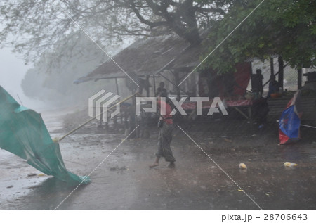 ラオスのチャムパサック 激しいスコールと強風で傘を飛ばされないように奮闘する女性