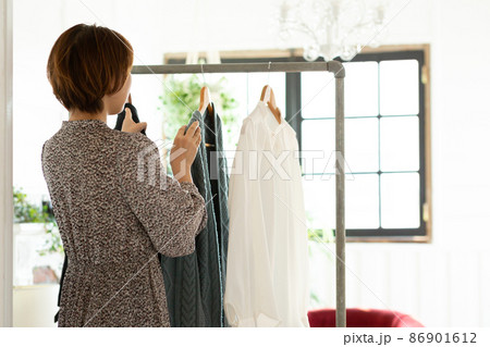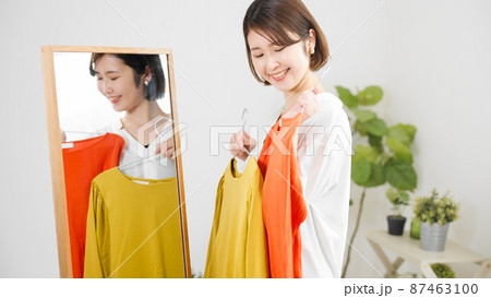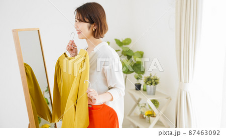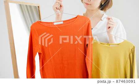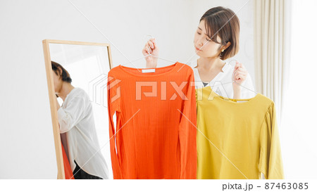 鏡の前で服選びをしている若い女性 ファッションイメージ