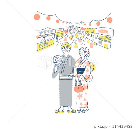 祭りの夜店と浴衣姿の若いカップル