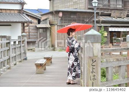 萩の城下町を散策する浴衣の女性