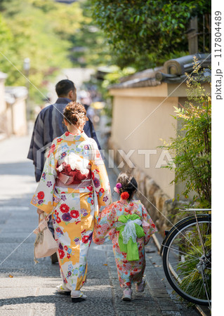 着物を着た散歩している家族の後ろ姿