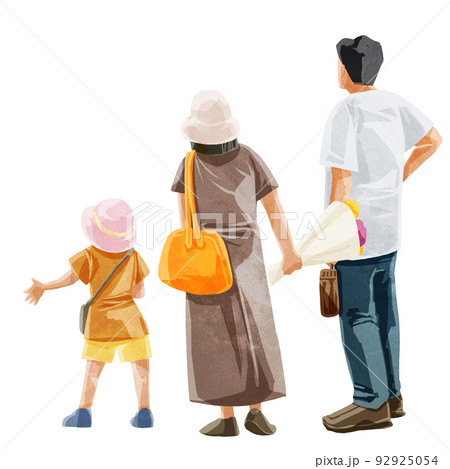 お出かけ中の親子3人後ろ姿手描き水彩風イラスト