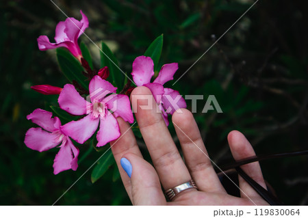 Pink oleander buds on a flowering shrub, flowers and delicate petals in a woman's hand. Unity with nature, relaxing in the park, garden in the spring. A woman, girl touching a blossoming tree.