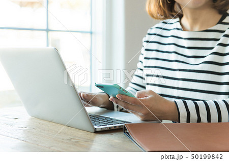 部屋でパソコンを操作するカジュアル姿のミドル女性