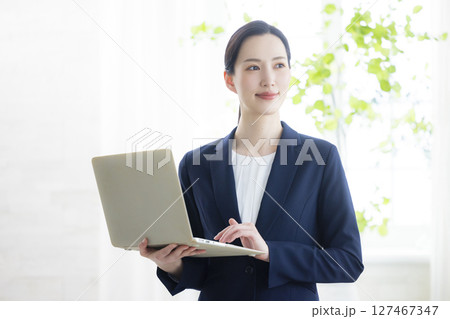 ノートパソコンを持つ笑顔のビジネスウーマン