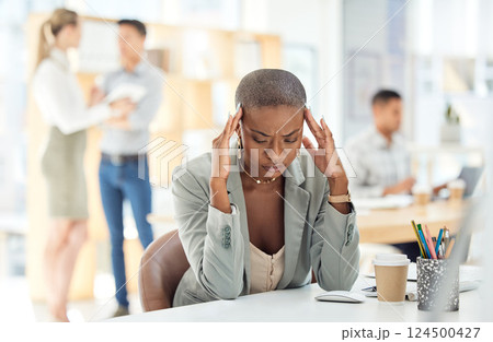 Black woman, stress and headache being overworked, experience burnout and frustrated with work at desk in office. Female employee, girl and business with mental health, feeling pain and exhausted.