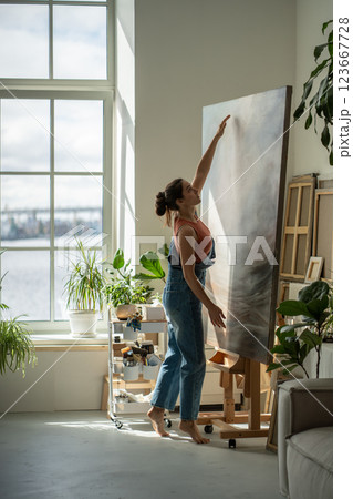 Positive optimistic woman painter embodies creative ideas expresses bright emotions in picture.