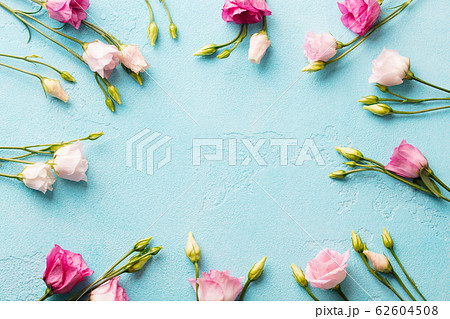 Frame of colorful flowers. Blue background. Top view. Copy space.