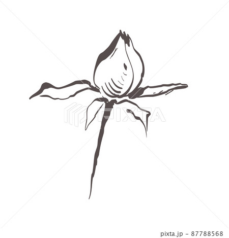 one stylized rose Bud on a short stem hand drawn sketch in black lines on a white background