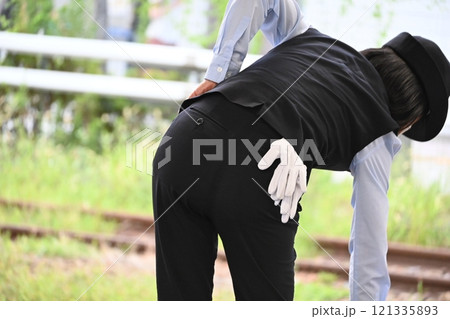 出発の合図を送る箱根登山電車の車掌さん(日本 神奈川県足柄下郡)