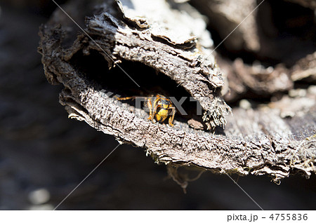 生き物 昆虫 ヤエヤマアシナガバチ、四月。巣の材料を集める?木材の表面がささくれ立っています