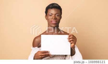 Smiling black young transgender model with blank poster