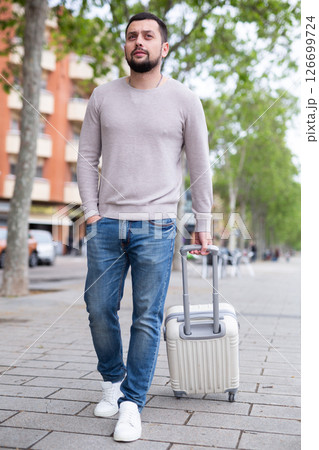 Confident young man walking with suitcase along city street