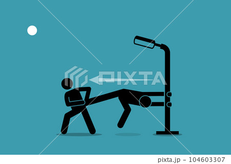 Man pulling and forcing someone to go, but he refused and grabbing himself to the lamp post. Vector illustration depicts concept of stubborn, unwilling, persistent, resolute, forceful, and hard sell.