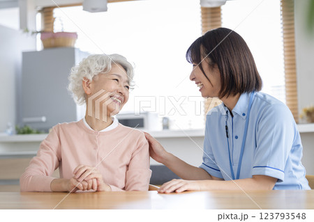 笑顔の女性介護スタッフとシニア女性