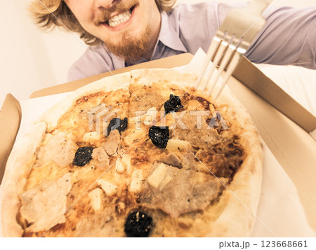 Man opening birthday gift box with red ribbon, receiving great present surprise, celebrating