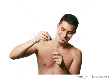 Cheerful, adorable young man smiling while using cosmetic product, moisturizing serum against white background.