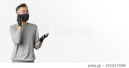 Concept of covid-19, social distancing and lifestyle. Image of handsome middle-aged man in medical mask and gloves, talking on mobile phone, standing over white background