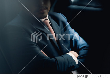 a portrait of businessman crossing his hands in car