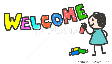 ウェルカムの英語を書いて歓迎と挨拶をする人物イラスト