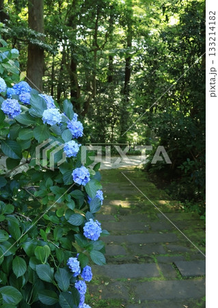 鎌倉の妙本寺にて、日差しの当たるあじさいが咲く参道の風景