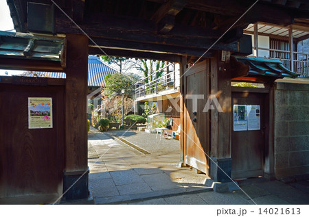 台東区谷中の寺町の風景(ヒマラヤ杉と妙行寺山門)