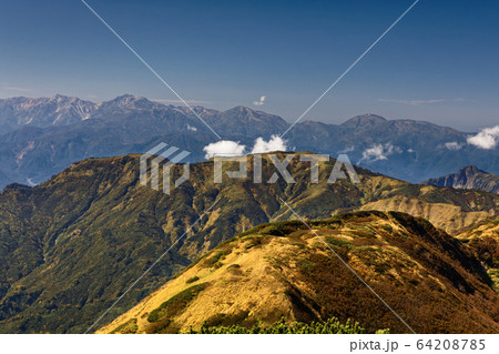 妙高連峰・黒沢山付近の紅葉と北アルプスの山並み
