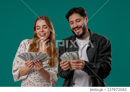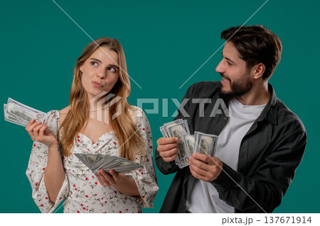 Surprised young man and woman holding dollar money cash, studio