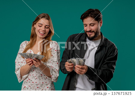 Rich Couple With USD Banknotes, Cash. Man And Woman Counting Money on Green
