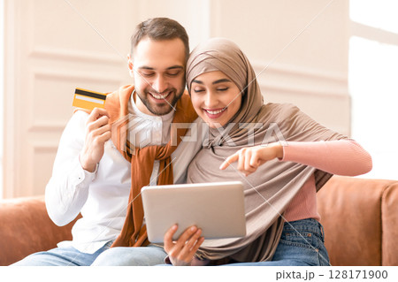 Online Shopping Concept. Muslim Arab Family Couple Holding Credit Card Using Digital Tablet Sitting On Couch At Home. Weekend Shopping, Internet Sales And Discounts Concept. Selective Focus