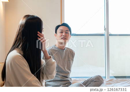 家のリビングでソファーに座る仲良しな若いアジア人夫婦