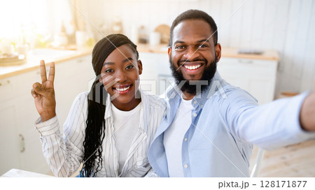Cheerful Black Spouses Taking Selfie While Drinking Morning Coffee Together, Happy African American Couple Posing For Photo, Sitting At Table In Kitchen And Smiling At Camera, Closeup Shot