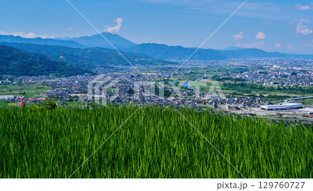 【姨捨の棚田】田植えの終わった水田と善光寺平【千曲市】