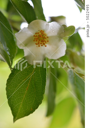 夏から梅雨の頃、緑の葉のわきに白い五弁花が涼しげに咲く。ナツツバキは「愛らしい」が花言葉だ。