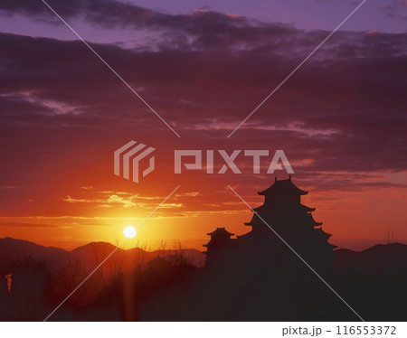 「世界文化遺産」「国宝」姫路城と初日の出と朝焼けの空(男山配水公園より展望)/兵庫県姫路