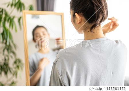 鏡の前で服選びをしている若い女性 ファッションイメージ