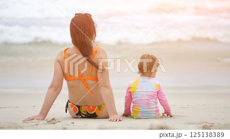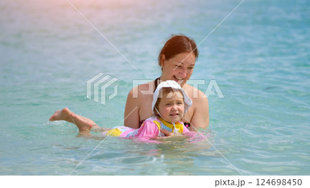 Mother and daughter enjoying crystal clear water in tropical paradise
