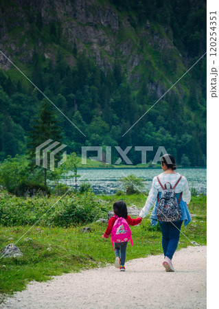 Mother Daughter holding hands and trekking Konigssee Lake in Bavaria Germany with Church by the Lake White Boat Forested Mountain and Beautiful Sunny Trekking in Berchtesgaden German Alps. High
