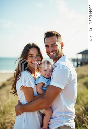 Joyful moments shared among a couple and their baby during a sunny day at the beach, surrounded by soft grass and the gentle ocean in the distance.