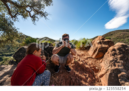 Caucasian adult male and child exploring mountain landscape with smartphones