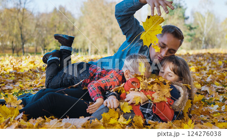 Family playing with golden leaves, laughing and bonding during sunny autumn afternoon in vibrant park setting, sharing warm moment