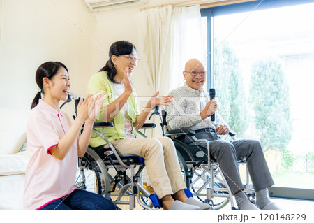 カラオケを楽しむ男女のベクターイラスト(歌声喫茶、歌唱教室、レクリエーション)