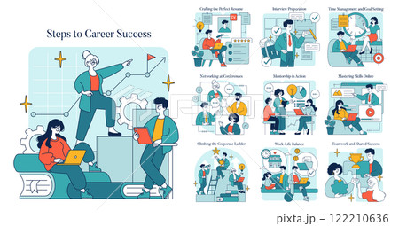 Steps to Career Success concept. This illustration provides essential strategies for achieving career success. It includes crafting resumes, networking, interview preparation, and mastering new skills