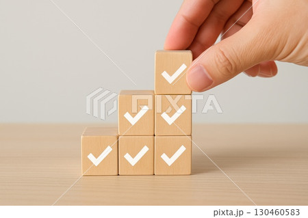 Task Completion Progress Using Wooden Cubes with Checkmarks Office Desk Visual Concept Minimalist Environment Close-up View