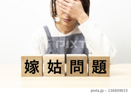 「嫁姑問題」と書かれたブロックとエプロン姿の女性