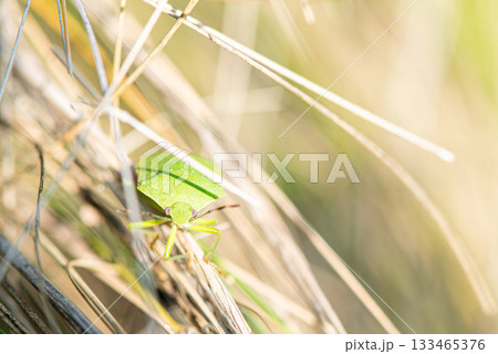 草の間から顔をのぞかせる黄緑色のカメムシ