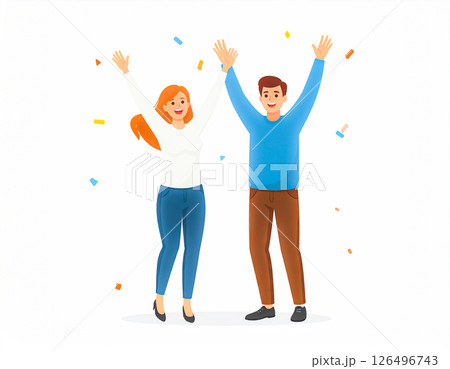 両手を上げて喜ぶ若い男女